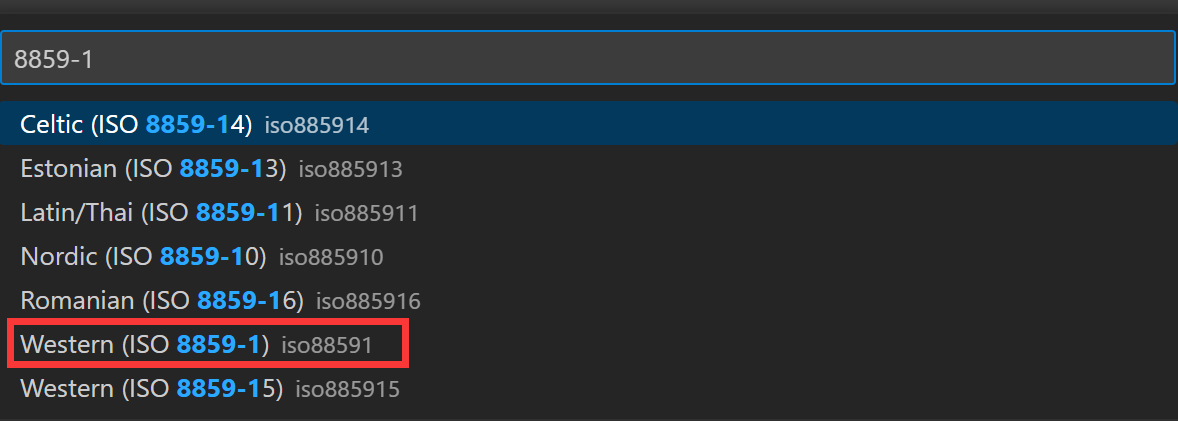 (3)选中后,再输入“8859-1”即可找到“Westen(ISO 8859-1)”这个选项: