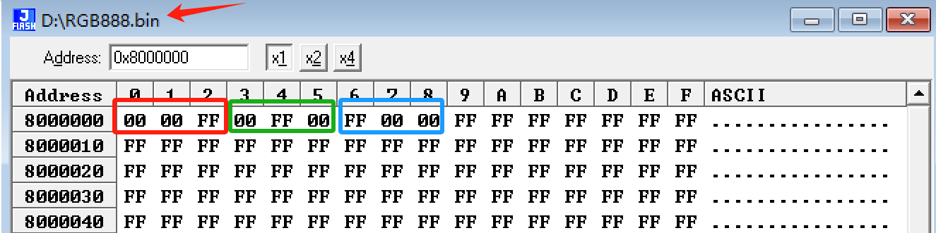 用转档软件(ImageTool等软件)取出来点阵数据就可以烧进FLASH使用,我们可以打开查看数据的二进制内容如下图,前三个字节为取出来是0xFF0000,即表示红色;接下来是0x00FF00表示绿色;最后一个是0x0000FF表示蓝色。注意数据是LSB->MSB存放,因此倒过来拼在一起。